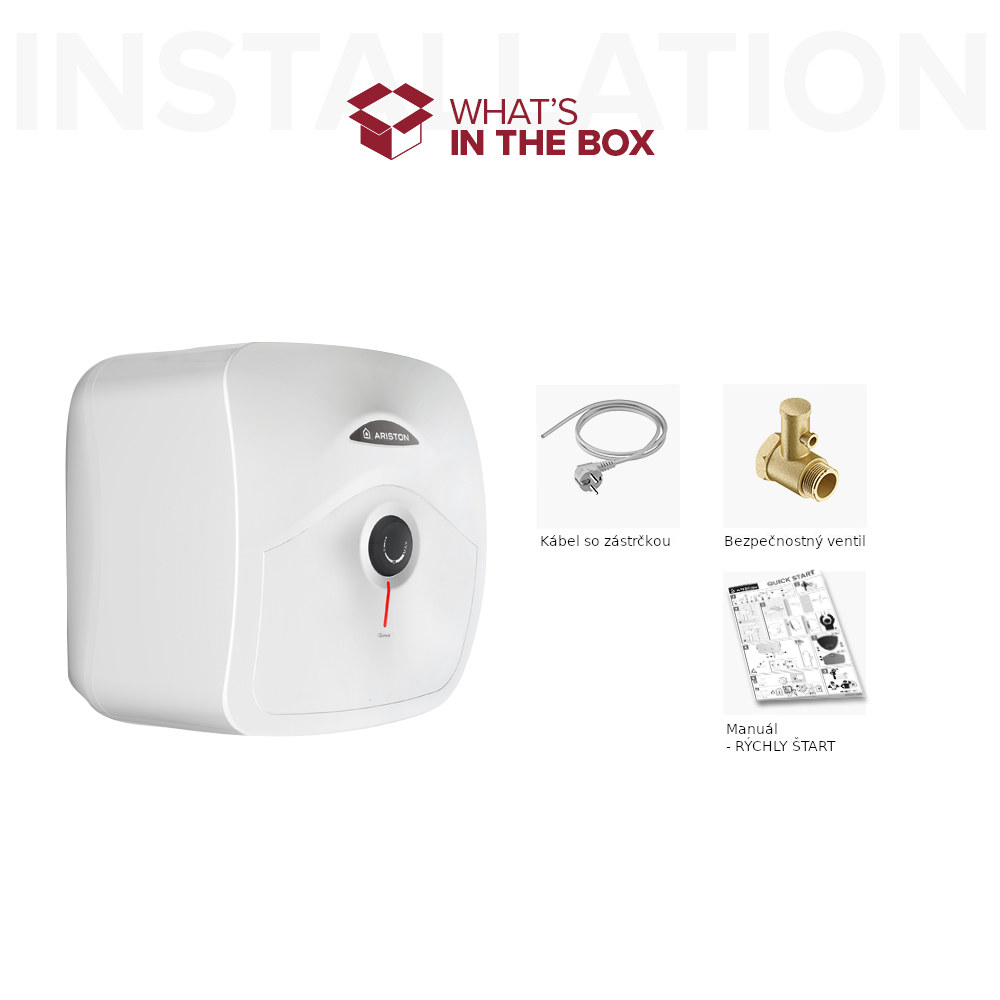 Malý elektrický ohrievač vody s objemom 10 l na inštaláciu pod umývadlo. Ovláda sa otočným termostatom.