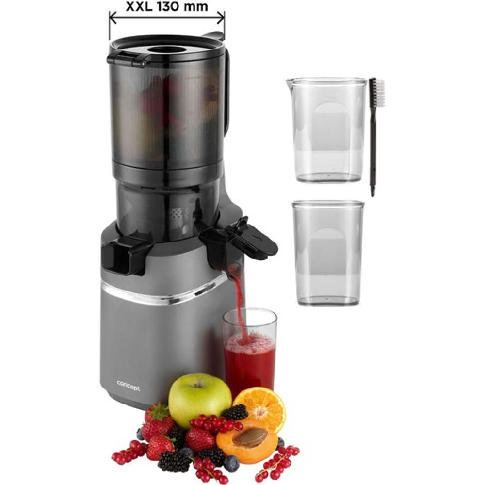 šnekový odšťavňovač; příkon 250 W; 1 stupeň rychlosti; objem nádoby na šťávu 1 l; objem nádoby na dužinu 0,8 l; velikost plnicího otvoru 13 cm; EXTRA velký plnicí otvor; snadné čištění; nízkootáčkový systém odšťavňování