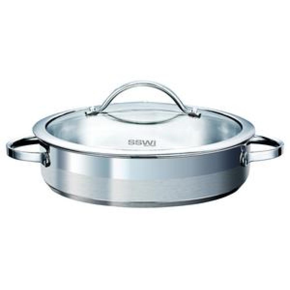 nerezový nízky kastról, objem 3 l, priemer 28 cm, s pokrievkou, vhodný na všetky druhy sporákov, matny povrch pre menej odtlačkov prstov, masívne nerezové úchyty, pokrievka s nerezovým úchytom a otvorom pre odvod pary, sendvičové dno, vhodne na umytie do umycky riadu,