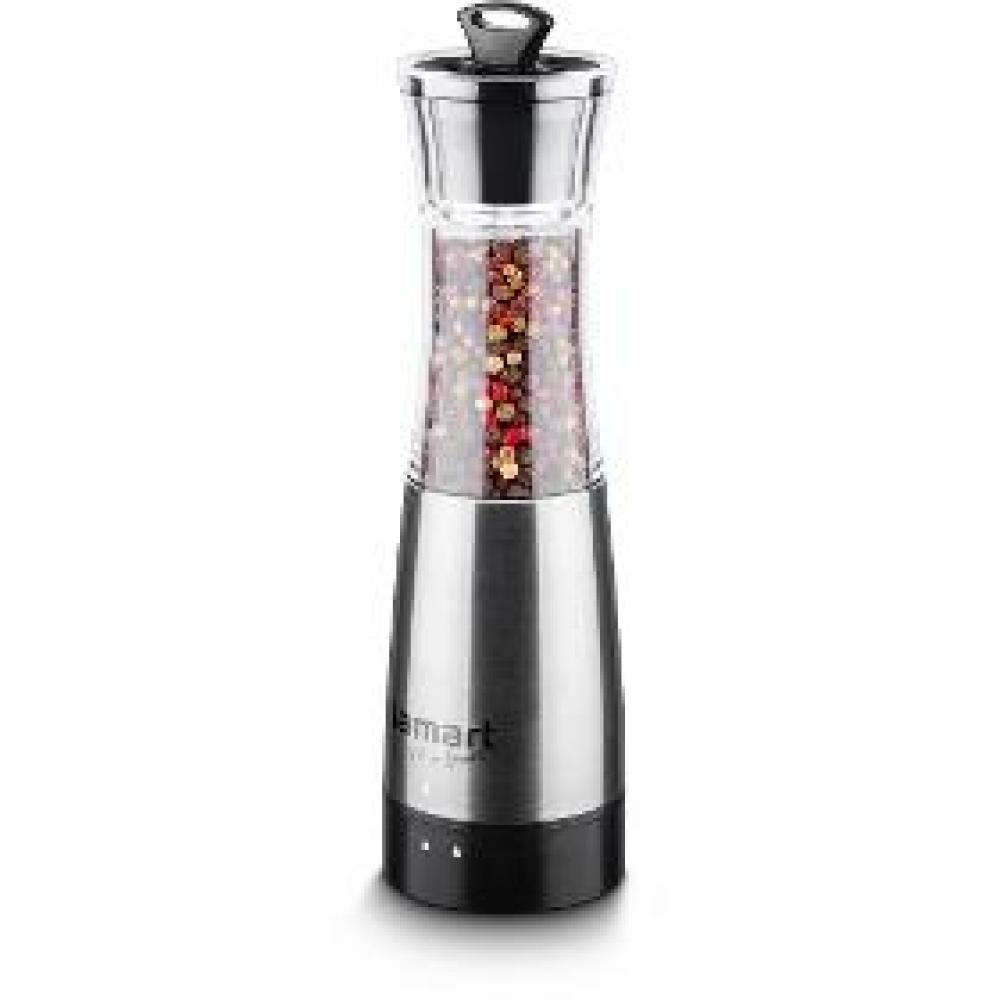 Mlynček na korenie/soľ, vyrobený z nehrdzavejúcej ocele/plastu, keramický mlynček s nastaviteľnou hrúbkou mletia, priehľadné komory, ovládanie mlynčeka jednou rukou po otočení o 180°, priemer 6 cm, výška 22,5 cm. Mlynček na korenie/čierne korenie/soľ je vyrobený z nehrdzavejúcej ocele a plastu s keramickým mlecím mechanizmom s nastaviteľnou hrubosťou mletia. Prehľadná doplňovacia komora umožňuje sledovať naplnenosť mlynčeka. Ovládanie mlynčeka jednou rukou po otočení o 180°, motorček mlynčeka na 6x AAA batérií (nie sú súčasťou). Súčasťou mlynčeka je viečko na zachytenie zvyškov korenia.