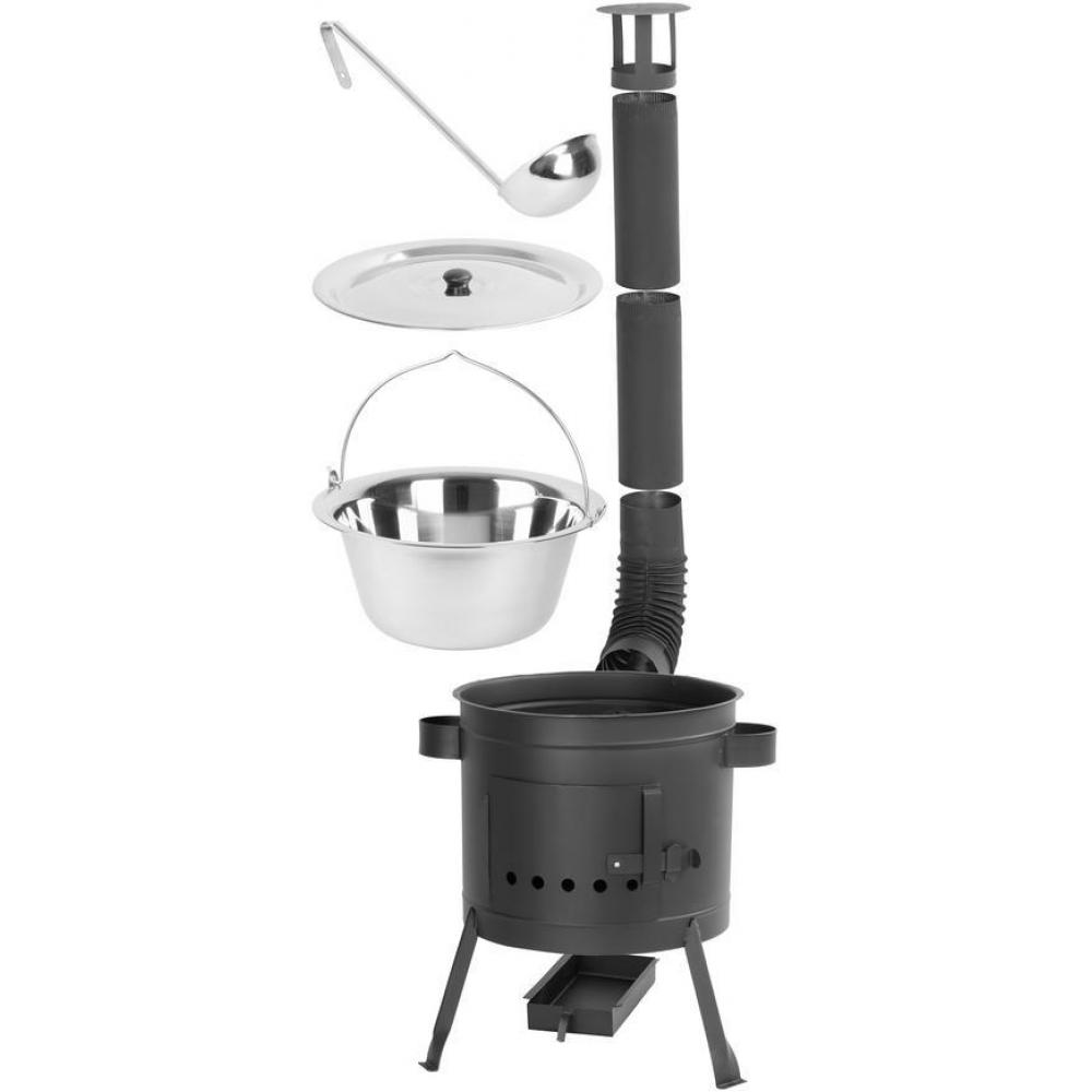 Obsah: - 1 ks železná Párty kotlina (priemer 36cm, výška 42cm) - 1 ks železná strieška - 2 ks železný dymovod - 1 ks železné koleno - 1 ks nerezový kotlík 13 litrový - 1 ks nerezová pokrievka - 1 ks nerezová naberačka - 1 ks varecha