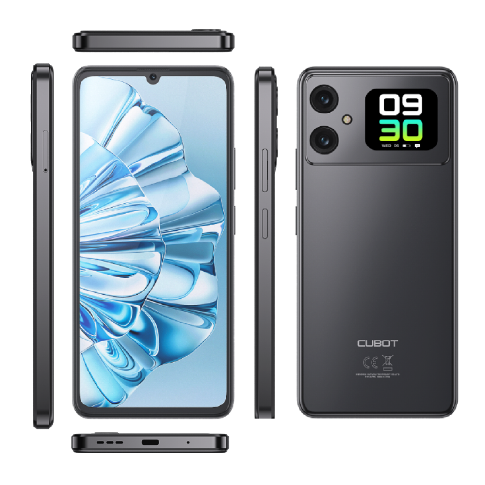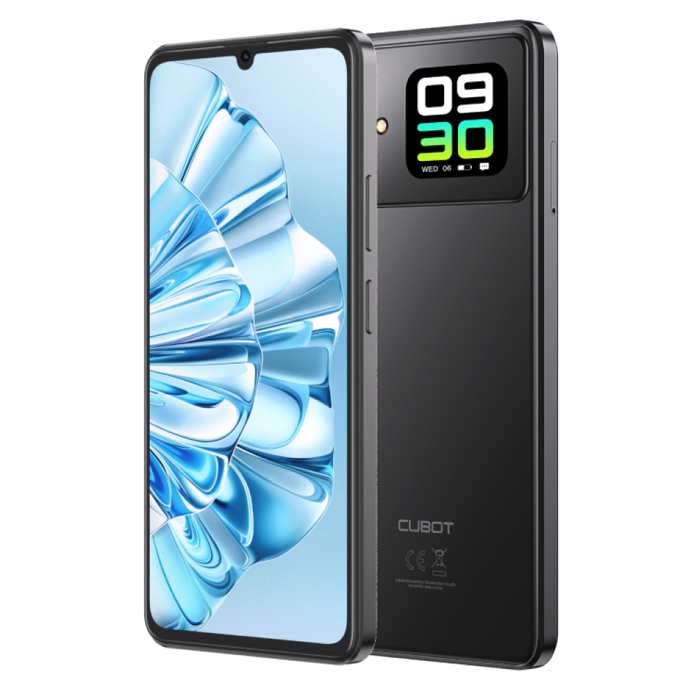 Cubot A20 zaujme na prvý pohľad. Elegantné telo skladajúce sa zo skla a plastu je dostupné v troch farbách – klasická čierna a modrá – takže si každý nájde to svoje. Okrem veľkého 6,75” IPS HD+ displeja s 90Hz obnovovacou frekvenciou má telefón aj menší 1,83” dotykový displej na zadnej strane, ktorý ukazuje upozornenie, umožňuje ovládať hudbu alebo rýchlo skontrolovať čas a stav batérie.